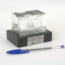 BLOCO (5X8X5 CM), EM VIDRO, COM BORDAS LAPIDADAS. NO INTERIOR, DESENHO TRIDIMENSIONAL GRAVADO, REPRESENTANDO UMA PLATAFORMA DE EXPLORAÇÃO DE PETRÓLEO, E A INSCRIÇÃO 'PETROBRÁS / SEVAM MARINE / FPSO SEVAN PIRANEMA'. FIXADO EM BASE DE GRANITO PRETO (2,5X10X7 CM) ONDE HÁ PLACA METÁLICA COM A GRAVAÇÃO 'ÁGUAS PROFUNDAS. UM MERGULHO NO FUTURO DO NORDESTE BRASILEIRO / PETROBRÁS'. ACONDICIONADO EM CAIXA VERDE.