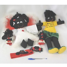 CONJUNTO DE ARTESANATOS COMPOSTO POR: UMA BONECA DE PANO NEGRA (39 CM), REPRESENTANDO UM ANJO, COM ASAS VERMELHAS E TÚNICA BRANCA; UM BONECO (53 CM) COM CAMISA AMARELA E SHORT VERDE, TENDO NA CAMISA A INSCRIÇÃO 'BRASIL UM PAÍS DE TODOS'; DOIS CHAVEIROS (13 CM CADA) EM BONECOS DE PANO (UM MENINO E UMA MENINA) SEGURANDO UMA ESTRELA VERMELHA; UM ELÁSTICO BRANCO PARA PRENDER CABELO, COM ROSTO DE UMA BONECA NEGRA; E UMA FAIXA VERMELHA DE CABELO, COM MESMO ROSTO COLADO A ELA. EM CADA OBJETO, A INSCRIÇÃO 'MAKENA'. ACONDICIONADOS EM SACOLA DE PAPEL CRAFT. ACOMPANHA FOLHETO COM DADOS DO AGENTE.