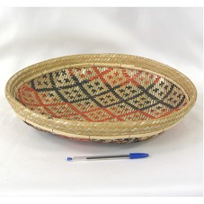CESTO INDÍGENA (5X40X40 CM), CONFECCIONADA EM PALHA. POSSUI A PARTE INTERNA PINTADA EM PRETO E VERMELHO, FORMANDO DESENHOS GEOMÉTRICOS. ACOMPANHA CARTÃO E FOLHETO EM NOME DO AGENTE.