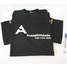 CAMISETA (TAM G) EM MALHA PRETA, DE MANGA CURTA. NA FRENTE, ESTAMPA MOSTRANDO A LETRA 'A' COM UMA DAS PARTES INTERROMPIDA, E A INSCRIÇÃO 'ACESSIBILIDADE / SIGA ESSA IDÉIA'. ATRÁS, MESMA LOGOMARCA E 'WWW.SIGAESSAIDEIA.ORG.BR'. NAS MANGAS, LOGOMARCAS DAS INSTITUIÇÕES 'CONADE', 'GOVERNO FEDERAL / SECRETARIA ESPECIAL DOS DIREITOS HUMANOS' E 'AMPID'.