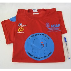 CAMISETA (TAM GG) EM MALHA VERMELHA, DE MANGA CURTA. NA FRENTE, ESTAMPA MOSTRANDO UM CÍRCULO AZUL COM DESENHO DE UMA CABEÇA HUMANA COM APARELHO AUDITIVO E A INSCRIÇÃO 'TODO SOM É MÚSICA / FÓRUM IMPLANTE COCLEAR'. NA PARTE SUPERIOR, LOGOMARCA DAS INSTITUIÇÕES 'POLITEC', 'COCHLEAR' E 'ADAP ASSOCIAÇÃO DOS DEFICIENTES AUDITIVOS, PAIS AMIGOS E USUÁRIOS DE IMPLANTE COCLEAR'.