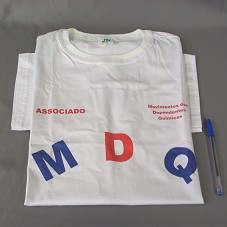 CAMISETA (TAM G) EM MALHA BRANCA, DE MANGA CURTA. NA FRENTE, EM VERMELHO E AZUL, A INSCRIÇÃO 'ASSOCIADO / MDQ / MOVIMENTO DOS DEPENDENTES QUÍMICOS'.