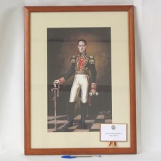 QUADRO (57X42 CM) COM MOLDURA EM MADEIRA, TAMPO DE VIDRO E PASSE-PARTOUT EM CARTÃO BEGE. EMOLDURA PINTURA (40X25 CM) RETRATANDO SIMON BOLIVAR VESTIDO COM UNIFORME E SEGURANDO A ESPADA. NO CANTO INFERIOR DIREITO, ASSINATURA DO ARTISTA 'E. PRIETO 2004'. ATRÁS, FOLHETO COM BREVE BIOGRAFIA DO AUTOR E A INSCRIÇÃO 'EL LIBERTADOR / SIMON BOLIVAR / ORIGINAL DE ELISEO PRIETO / 2004 / CARACAS VENEZUELA / E. PRIETO 2006'. ACOMPANHA CARTÃO EM NOME DO PRESIDENTE DA VENEZUELA, HUGO CHAVES.