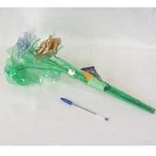 BUQUÊ DE FLORES (45 CM) CONFECCIONADO COM A RECICLAGEM DE GARRAFA PET, CONTENDO QUATRO FLORES NAS CORES VERDE, AZUL, TRANSPARENTE E DOURADA. ACOMPANHA CARTÃO DE VISITA EM NOME DO AGENTE.