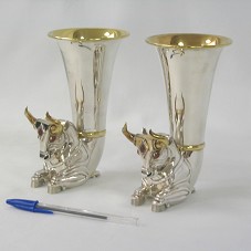 PAR DE TAÇAS (16 CM) CONFECCIONADAS EM PRATA, COM DETALHES EM OURO, BRILHANTE E ÂMBAR. MOLDADA EM FORMATO CÔNICO, TENDO NA BASE A FIGURA DE UM TOURO. ACOMPANHA FOLDER EXPLICATIVO E CARTÃO EM NOME DO AGENTE. ACONDICIONADAS EM ESTOJO DE COURO.