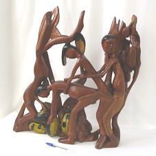 ESCULTURA (59 CM), EM MADEIRA, COM CONOTAÇÃO ERÓTICA, MOSTRANDO, EM UM DOS LADOS, TRÊS HOMENS ENCAIXADOS E UM DELES CATANDO FRUTO DE TONALIDADE AMARELADA, SEMELHANTE AO CACAU. NA PARTE INFERIOR DA BASE, A INSCRIÇÃO 'ADILSON RIB.'.
