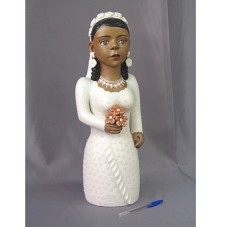 ESCULTURA (49,5 CM), CONFECCIONADA EM ARGILA, REPRESENTANDO UMA MULHER MORENA VESTIDA DE NOIVA, SEGURANDO UM RAMALHETE DE FLORES. POSSUI O VESTIDO TRABALHADO, COM DESENHOS DE FLORES E DECORAÇÃO IMITANDO RENDA. NO REVERSO, A INSCRIÇÃO 'IRENE DE COQUEIRO CAMPO / MINAS NOVAS / MINAS GERAIS'.