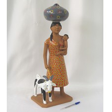 ESCULTURA (55 CM), CONFECCIONADA EM ARGILA, REPRESENTANDO UMA MULHER COM VESTIDO VERMELHO, CARREGANDO UMA TROUXA DE ROUPA NA CABEÇA, UMA CRIANÇA NOS BRAÇOS E SEGURANDO UM CABRITO MALHADO POR UMA CORDA. NO FUNDO DA BASE, A INSCRIÇÃO 'ANTONIO RODRIGUES'.