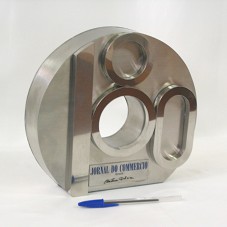 ESCULTURA (23X25X5 CM) LAMINADA EM CHAPA DE AÇO, DE FORMATO CIRCULAR. NA FRENTE, EM ALTO RELEVO, O NÚMERO '180', COM UMA PARTE DO OITO VAZADA. E NA PARTE INFERIOR, PLACA COM A INSCRIÇÃO 'JORNAL DO COMMERCIO / BRASIL / CHRISTINA OITICICA'. A ESCULTURA É UM TROFÉU EM COMEMORAÇÃO AOS 180 ANOS DO JORNAL DO COMMERCIO.