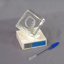ESCULTURA (7X7X7 CM), EM VIDRO, NO FORMATO DE UM CUBO COM AS ARESTAS BISOTADAS. NO CENTRO DELE, A LOGOMARCA DO 'BIO-MANGUINHOS' GRAVADA A LASER. PRESO POR UMA DAS ARESTAS À UMA BASE DE MÁRMORE BEGE (3X9X9 CM), ONDE NA PARTE FRONTAL HÁ PLACA METÁLICA COM A INSCRIÇÃO 'CENTRO DE PRODUÇÃO DE ANTÍGENOS VIRAIS / BIO-MANGUINHOS SAÚDA O PRESIDENTE DA REPÚBLICA LUIZ INÁCIO LULA DA SILVA / INAUGURADO EM 1º DE OUTUBRO DE 2007'.