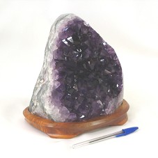 AMOSTRA (19X18,5X12 CM) DE CRISTAL DE ROCHA, DE COR LILÁS ARROXEADA. POSSUI PARTE FRONTAL E LATERAIS POLIDAS LAPIDADAS. ENCAIXADA SOBRE BASE DE MADEIRA.