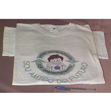 CAMISETA BRANCA (TAM 'M') EM MALHA, COM O SÍMBOLO DA ASSOCIAÇÃO AMIGOS DO FUTURO ('PENSO AMBIENTALMENTE AJO AMBIENTALMENTE SOU AMIGO DO FUTURO'), NA FRENTE DA CAMISETA, E, A INSCRIÇÃO 'MEIO AMBIENTE, MEU AMBIENTE. EU CUIDO!' (NAS COSTAS). ACONDICIONADA EM GARRAFA PET DE REFRIGERANTE, ACOMPANHADA DE FOLDER.