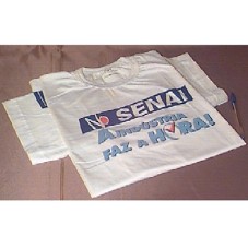 DUAS CAMISETAS (TAM. 'G') EM MALHA BRANCA, COM INSCRIÇÃO EM AZUL, NA PARTE FRONTAL, 'NO SENAI A INDÚSTRIA FAZ A HORA!'. EM CADA MANGA HÁ UM QUADRADO AZUL NO QUAL ESTÁ ESCRITO EM BRANCO 'FIEMT SENAI'.