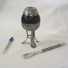 CONJUNTO DE CUIA (14,5 CM) E BOMBA (19 CM) PARA CHIMARRÃO. CUIA EM CABAÇA PRETA, COM PÉS E DETALHES EM PRATA 800. BOMBA TRABALHADA EM MESMO MATERIAL, COM DETALHES EM DOURADO. ACOMPANHA FOLHETO COM A INSCRIÇÃO 'SOUVENIR FROM HERNANDIANA FOUNDATION / AUTETIC ARGENTIAN MATE / ARGENTINA'. ACONDICIONADO EM CAIXA AZUL MARINHO.