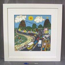 QUADRO COM MOLDURA (61X.61 CM) EM MADEIRA LAMINADA DE BRANCO, E PASSE-PARTOUT EM MESMO MATERIAL. EMOLDURA PINTURA (38,5X38,5 CM) SOBRE TELA, RETRATANDO PONTOS TURÍSTICOS DA PAISAGEM DA CIDADE DO RIO DE JANEIRO, COMO O CORCOVADO, O PÃO DE AÇÚCAR, O CRISTO REDENTOR, PRAIAS E ETC. NO CANTO INFERIOR DIREITO, ASSINATURA DO ARTISTA 'DALVAN'. ATRÁS, A INSCRIÇÃO 'Nº 485 / UM DIA NO RIO DE JANEIRO'.