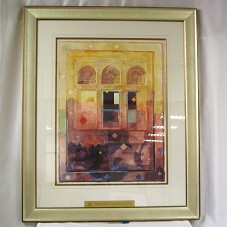 PINTURA SOBRE PAPEL (76,5X57 CM), EM AQUARELA, REPRESENTANDO TRÊS JANELAS COM MUXARABIS, E BANDEIRAS ORNADAS COM MOTIVOS ÁRABES. PREDOMINA TONS PASTÉIS EM BEGE, MARROM, AMARELO E VERMELHO. NO CANTO INFERIOR DIREITO, ASSINATURA DO ARTISTA, EM ÁRABE (NÃO IDENTIFICADA). POSSUI MOLDURA (117,5X96 CM) EM LAMINADO DOURADO, TAMPO DE VIDRO E PASSE-PARTOUT BEGE COM FRISO DOURADO. NA PARTE INFERIOR, PLACA EM METAL DOURADO COM A INSCRIÇÃO 'PRESENTED TO HIS EXCELLENCY LUIZ INÁCIO LULA DA SILVA TO COMMEMMORATE THE INAUGURAL FLIGHT BY EMIRATES TO SÃO PAULO FROM DUBAI / 10TH OCTOBER 2007'.