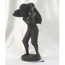 ESCULTURA (55 CM), EM MADEIRA ÉBANO, REPRESENTANDO UM HOMEM NEGRO VESTIDO APENAS COM BERMUDA, SEGURANDO E CARREGANDO UM SACO PESADO NAS COSTAS. POSSUI BASE CIRCULAR.