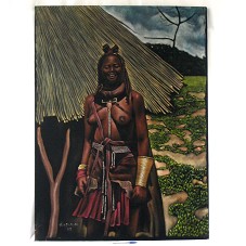PINTURA (111X82 CM) SOBRE VELUDO PRETO RETRATANDO UMA MULHER AFRICANA SEMINUA, MOSTRANDO, AO FUNDO, PARTE DA TRIBO E VEGETAÇÃO. NO CANTO INFERIOR DIREITO, ASSINATURA DO ARTISTA 'B.V PULULU 07'.