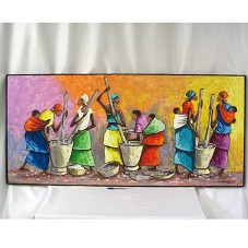 PINTURA (64,5X140 CM) SOBRE TELA RETRATANDO UM GRUPO DE MULHERES NEGRAS SOCANDO FARINHA EM PILÕES. ALGUMAS CARREGAM OS FILHOS AMARRADOS AO CORPO, ENQUANTO TRABALHAM. PINTURA COM TONS COLORIDOS E FORTES. NO CANTO INFERIOR DIREITO, ASSINATURA DO ARTISTA 'KABONGO 07'. POSSUI MOLDURA EM MADEIRA PINTADA DE PRETO.
