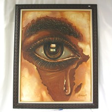PINTURA (116X89 CM) SOBRE TELA, RETRATANDO UM OLHO CHORANDO. PREDOMINA OS TONS DE MARROM E BEGE. SOBRANCELHA TEXTURIZADA COM BARBANTE. NO CANTO INFERIOR DIREITO, ASSINATURA DO ARTISTA 'N. KADIMINA / 05'. POSSUI MOLDURA (133,5X106,5 CM) EM MADEIRA TRABALHADA, IMITANDO UM TRANÇADO, EM TOM ESCURO; PASSE-PARTOUT EM TECIDO BEGE, COM FRISO DOURADO. ATRÁS, EMAIL E TELEFONE DO ARTISTA '[email protected] / TEL 24267655810'.