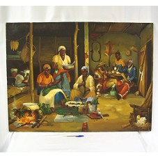 PINTURA (75X99,5 CM) SOBRE TELA, RETRATANDO A PARTE INTERNA DE UMA CASA DE TAIPA, MOSTRANDO TRÊS CENAS: EM PRIMEIRO PLANO, DUAS MULHERES SENTADAS LIMPANDO PEIXE; NA LATERAL ESQUERDA, UM HOMEM, AO FUNDO, PINTANDO UMA TELA; NA LATERAL DIREITA, DOIS HOMENS SENTADOS À MESA, SENDO SERVIDOS POR UMA MULHER. PREDOMINA TONS ESCUROS. NO CANTO INFERIOR DIREITO, ASSINATURA DO ARTISTA 'D. MOUELLO / 2007. ATRÁS, A INSCRIÇÃO 'DENIS N. MOUELLO / LA PRÉPARATION DES MABOKÉS / MAI-JUIN 2007'.