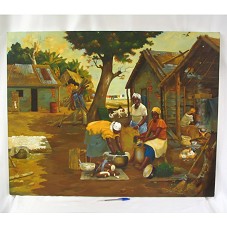 QUADRO SEM MOLDURA, COM PINTURA (74X94 CM) SOBRE TELA, RETRATANDO UM VILAREJO, COM CASAS EM TAIPA. EM PRIMEIRO PLANO, TRÊS MULHERES PREPARANDO FARINHA DE MANDIOCA; MAIS AO FUNDO, UM HOMEM CARREGANDO PEDAÇOS DE MADEIRA. PREDOMINA TONS ESCUROS, DE MARROM E VERDE. NO CANTO INFERIOR DIREITO, ASSINATURA DO ARTISTA 'DENIS N. MOUELLO 2007'. ATRÁS, 'DENIS N. MOUELLO / AU VILLAGE / JUIN - AOÛT 2007'.