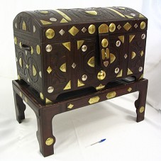 BAÚ (46X42,5X69,5 CM) CONFECCIONADO EM MADEIRA, FORRADO EXTERNAMENTE EM COURO MARROM, TRABALHADO COM DESENHOS FLORAIS E DE ARABESCOS, E ORNADO COM PEÇAS METÁLICAS DOURADAS E PRATEADAS. POSSUI INTERIOR FORRADO EM VELUDO COLORIDO, COM MOTIVOS FLORAIS. ACOMPANHA BASE (30X48X75 CM) EM MESMO MATERIAL, FORMANDO UMA MESA BAIXA DE APOIO PARA O BAÚ.