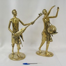 DUAS ESCULTURAS EM METAL DOURADO REPRESENTANDO DOIS MÚSICOS. A PRIMEIRA (43,5 CM), UM HOMEM TOCANDO UM TIPO DE TAMBOR, QUE CARREGA COM UMA CORDA PELO PESCOÇO, E COM OS BRAÇOS PARA CIMA. A SEGUNDA (40 CM), OUTRO HOMEM TOCANDO UM BANDOLIM. OS DOIS ESTÃO COM AS PERNAS EM POSIÇÃO DE MOVIMENTO.