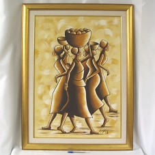 PINTURA (79,5X56 CM) SOBRE TELA, EM TONS DE MARROM E BEGE, RETRATANDO UM GRUPO DE MULHERES NEGRAS, ALGUMAS CARREGANDO CESTAS NA CABEÇA, ANDANDO EM DIREÇÕES OPOSTAS. POSSUI MOLDURA (96X72,5 CM) EM MADEIRA LAMINADA DE DOURADO, PASSE-PARTOUT EM TECIDO BEGE, COM FRISO DOURADO. NO CANTO INFERIOR DIREITO, ASSINATURA DO ARTISTA 'ARABAK 006'. ACOMPANHA CARTÃO EM NOME DO AGENTE.