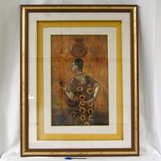 PINTURA (50X31,5 CM) SOBRE LATÃO, RETRATANDO, EM ALTO RELEVO, UMA MULHER NEGRA CARREGANDO UMA CRIANÇA AMARRADA ÁS SUAS COSTAS, UM VASO NA CABEÇA E UMA CABAÇA EM UMA DAS MÃOS. POSSUI TONS DE MARROM, DOURADO E VERMELHO. MOLDURA (82X63,5 CM) EM MADEIRA COM DETALHES EM DOURADO; PASSE-PARTOUT EM TECIDO BEGE E AMARELO, COM FRISO DOURADO. NO CANTO INFERIOR DIREITO, ASSINATURA DO ARTISTA 'KASADI-KAS / 04'. ACOMPANHA CARTÃO EM NOME DO AGENTE.