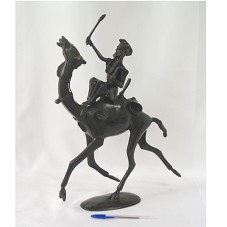 ESCULTURA EM BRONZE, FORMADA POR DUAS PEÇAS. A PRIMEIRA (42X36X9 CM), UM CAMELO SELADO EM POSIÇÃO DE CORRIDA, COM O PESCOÇO VIRADO; A SEGUNDA (21X9X10 CM), UM HOMEM SENTADO SEGURANDO UM BASTÃO. ESTA SE ENCAIXA NA SELA DO CAMELO.