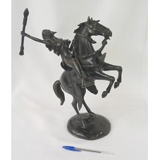ESCULTURA EM BRONZE, FORMADA POR DUAS PEÇAS. A PRIMEIRA (37 CM), UM CAVALO EM POSIÇÃO DE ATAQUE, COM AS DUAS PATAS DIANTEIRAS ERGUIDAS; A SEGUNDA (26 CM), UMA MULHER SEGURANDO UMA LANÇA E CARREGANDO NAS COSTAS O ARCO E FLECHAS, POSSUI NO CABELO ORNAMENTO COM PENA. ESTA SE ENCAIXA NA SELA DO CAVALO. ACOMPANHA CARTÃO DE VISITA DO REMETENTE.