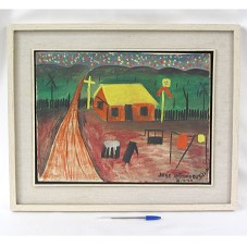 PINTURA (30X40 CM) SOBRE TELA, RETRATANDO UM CENÁRIO RURAL, TENDO, EM PRIMEIRO PLANO, UMA CASA COM TELHADO AMARELO, UM VARAL DE ROUPAS, UM POÇO ARTESIANO E UMA ESTRADA CORTANDO O TERRENO, LADEADO POR CERCA DE MADEIRA. AO FUNDO, CAMPO MONTANHOSO EM TONS DE VERDE E PRETO. PINTURA NAIF. NO CANTO INFERIOR DIREITO, ASSINATURA DO ARTISTA 'JOSÉ ANTONIO DA SILVA / 8-5-57'. POSSUI MOLDURA (43,5X53 CM) EM MADEIRA COM PÁTINA BRANCA, PASSE-PARTOUT EM TECIDO BEGE, COM OUTRA MOLDURA EM MESMO MATERIAL. NA PARTE POSTERIOR, DEDICATÓRIA (QUASE APAGADA) 'AO CARO AMIGO DR. FULVIO PILEGGI / JOVEM GLÓRIA DA MEDICINA BRASILEIRA, SENSIBILIDADE ATENTA ÀS COISAS DA ARTE E DO ESPIRITO. / CASSIANO RIVENDO / 1966'.