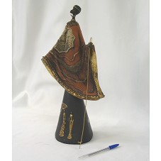 ESCULTURA (41 CM), CONFECCIONADA EM ARGILA, REPRESENTANDO UMA MULHER NEGRA SEGURANDO UM CAJADO EM METAL DOURADO. VESTE UMA SAIA PRETA ONDE HÁ DESENHOS, EM ALTO RELEVO, DE MULHERES E ÁRVORES, EM DOURADO; E UMA TÚNICA EM MARROM E DOURADO, TEXTURIZADA EM TECIDO. NO FUNDO DA ESCULTURA, ETIQUETA DO FABRICANTE E SELO DE PRÊMIO DE DESIGN E ARTESANATO. ACONDICIONADA EM CAIXA DE SAPATO, COM A INSCRIÇÃO 'FASCAR'.