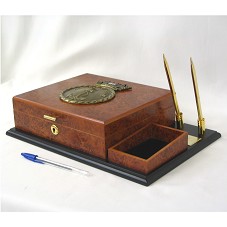 ESTOJO (7X24X21,5 CM) PARA CHARUTO, CONFECCIONADO EM MADEIRA, TENDO NA TAMPA O BRASÃO DA 'MARINHA DO BRASIL', E COM DETALHES EM METAL DOURADO. NA PARTE INTERNA, HIDRÔMETRO, TESOURA DE CORTE DO FUMO E CHAVES DO ESTOJO. FIXADO EM BASE (35X24,5 CM) DE MADEIRA PRETA, ONDE HÁ, TAMBÉM, PORTA-CARTÃO NO MESMO MATERIAL DO ESTOJO, E DOIS PORTA-CANETAS, EM METAL DOURADO. NA BASE, PLACA EM METAL DOURADO COM A INSCRIÇÃO 'AO EXCELENTÍSSIMO SENHOR PRESIDENTE DA REPÚBLICA FEDERATIVA DO BRASIL, LUIZ INÁCIO LULA DA SILVA, OFERECE O COMANDANTE DA MARINHA, ALMIRANTE-DE-ESQUADRA JULIO SOARES DE MOURA NETO, POR OCASIÃO DO TRANSCURSO DE SEU ANIVERSÁRIO. BRASÍLIA, DF, EM 27 DE OUTUBRO DE 2007'. ACOMPANHA DUAS CANETAS ESFEROGRÁFICAS EM METAL DOURADO, ACONDICIONADAS NO INTERIOR DO ESTOJO.