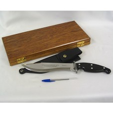 FACA (39 CM) COM LÂMINA EM AÇO INOX CROMO MOLIBDÊNIO, COM 5,0MM DE ESPESSURA, ONDE HÁ GRAVADO A INSCRIÇÃO 'LUIZ INÁCIO LULA DA SILVA / PRESIDENTE DO BRASIL / TRAMONTINA'. POSSUI CABO EM POLYWOOD, GUARNIÇÃO EM AÇO INOX E REBITES DE LATÃO. ACOMPANHA BAINHA EM COURO NATURAL, NA COR PRETA, COM DISPOSITIVO PARA AJUSTAR POSIÇÃO. ACONDICIONADA EM ESTOJO DE MADEIRA, ONDE HÁ PEQUENO FOLDER COM DESCRIÇÃO DA PEÇA E CERTIFICADO DE GARANTIA (NÃO PREENCHIDO).