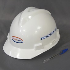 CAPACETE DE PROTEÇÃO, UTILIZADO EM CONSTRUÇÃO CIVIL, NA COR BRANCA. NAS LATERAIS, ETIQUETA COM A INSCRIÇÃO 'PRESIDENTE LULA'. NA FRENTE, 'ESTALEIRO MAUÁ'.
