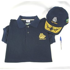 CAMISA GOLA PÓLO (TAM GG) EM TECIDO AZUL MARINHO, DE MANGA CURTA. NA FRENTE, BORDADO EM DOURADO, UM NAVIO E A INSCRIÇÃO 'CISNE BRANCO'. ATRÁS, A BANDEIRA DO BRASIL. ACOMPANHA BONÉ EM TECIDO AZUL MARINHO, COM MESMO BORDADO NA PARTE FRONTAL. EM UMA DAS LATERAIS, BANDEIRA DO BRASIL; NA OUTRA, 'PRESIDENTE LULA'. NA ABA, DESENHO BORDADO EM AMARELO OURO.