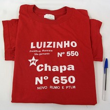 CAMISETA (TAM M) EM MALHA VERMELHA, DE MANGA CURTA. NA FRENTE, ESTAMPA EM BRANCO, COM A INSCRIÇÃO 'LUIZINHO / PRESIDENTE MUNICIPAL DE SÃO BERNARDO / Nº 550 / CHAPA Nº 650 / NOVO RUMO E PTLM'.
