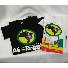 DUAS CAMISETAS (TAM M E G) IGUAIS, DE MANGA CURTA, UMA EM MALHA BRANCA, OUTRA EM PRETA. NA FRENTE, ESTAMPA MOSTRANDO UM CÍRCULO VERDE COM FUNDO AMARELO, TENDO EM SEU INTERIOR O MAPA DO BRASIL COM FOTOGRAFIA DE UM ROSTO DENTRO. ABAIXO, A INSCRIÇÃO 'GRUPO CULTURAL AFROREGGAE'. NA BARRA DAS CAMISETAS, EM VERMELHO, AMARELO E VERDE, PINTURA MOSTRANDO PERFIL DE CIDADE.