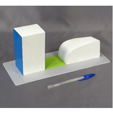 MAQUETE VOLUMÉTRICA (12X25X5,5 CM) REPRESENTANDO O EDIFÍCIO SEDE UNE E TEATRO, EM DOIS BLOCOS: O PRIMEIRO, RETANGULAR COM DUAS FACES EM AZUL; O SEGUNDO, MAIS BAIXO, COM UMA DAS FACES CHANFRADA E OUTRA CURVA ENCONTRANDO COM COBERTURA. ENTRE ELES, UM JARDIM. FIXADOS EM BASE CINZA. PROJETO DE OSCAR NIEMEYER E JOÃO NIEMEYER.