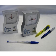 DOIS RELÓGIOS DE MESA (3X7,5X12,5 CM) PRATEADO, COM A INSCRIÇÃO 'A INDÚSTRIA FAZ A HORA! FIEMT SENAI / SENAI É MAIS BRASIL É MAIS MATO GROSSO 1942 2002' E DUAS CANETAS, SENDO UMA EM PLÁSTICO AMARELO E AZUL, COM INSCRIÇÃO ' PRÉ EMPREGO SENAI O INÍCIO DE SUA CARREIRA DE SUCESSO' E A OUTRA COM EM PLÁSTICO PRATEADO E AZUL MARINHO, COM A INSCRIÇÃO 'A INDÚSTRIA FAZ A HORA!' , ACOMPANHA PILHAS, UM LIVRO INFORMATIVO 'A INDÚSTRIA FAZ A HORA EDUCAÇÃO E TECNOLOGIA QUE CABEM EM SEU TEMPO 2002/2003' E UM CARTÃO DO REMETENTE. ACONDICIONADOS CAIXAS DE PAPELÃO (3X26X40 CM) NA COR VERDE DO SENAI.