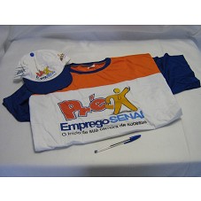 UMA CAMISETA (TAM XXG) EM MALHA BRANCA, MANGAS E GOLA AZUL E PEITORAL LARANJA, COM A ESTAMPA DA LOGOMARCA DO PROGRAMA 'PRÉ-EMPREGO SENAI / O INÍCIO DE SUA CARREIRA DE SUCESSO' NA FRENTE, E NAS COSTAS AS INSCRIÇÕES 'WWW.SENAIMT.COM.BR / FIEMT / SENAI / FALE COMIGO' E UM BONÉ EM BRIM BRANCO COM A ABA NA COR AZUL, CONTENDO TAMBÉM A LOGOMARCA DO PROGRAMA. NAS LATERAIS AS INSCRIÇÕES 'MAIS BRASIL / SENAI/ É MAIS MATO GROSSO' E 'FIEMT / SENAI'.
