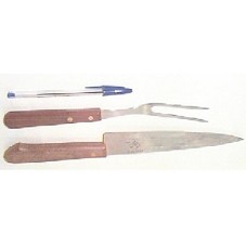 UMA FACA E UM GARFO DE CHURRASCO, COM CABO DE MADEIRA. A FACA CONTÉM EM UM LADO DA LÂMINA O DESENHO DE UM BOI E SEUS CORTES COM NOMES, E GRAVADO 'VENDA TÉCNICA 66 - 422.3046'. NO OUTRO LADO DA LÂMINA ESTÁ GRAVADO 'PRESIDENTE LUIZ INÁCIO LULA DA SILVA 06-06-03' E, TEM O EMBLEMA DA CYDECTIN NF 'CAMPEÃO EM GANHO DE PESO'. ACONDICIONADOS EM TUBO (32,5X4,5 CM) DE PAPELÃO, FORRADO DE PAPEL BRANCO, COM EMBLEMA DA CYDECTIN NF EM VERDE.