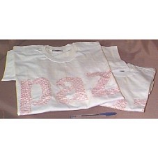 DUAS CAMISETAS (TAM 'G' E 'GG') EM MALHA BRANCA, ESCRITO 'PAZ' NA FRENTE. A INSCRIÇÃO FOI COMPOSTA PELA MESMA PALAVRA ESCRITA EM DIVERSAS LÍNGUA, NA COR VERMELHA. NA PARTE POSTERIOR: 'ALLIANCEMKT WWW.ALLIANCE-MKT.COM'.
