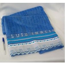 TOALHA DE BANHO, NA COR AZUL. POSSUI BORDA TRABALHADA COM FITAS DE CETIM E BORDADO COM A INSCRIÇÃO 'LUIZ INACIO'.