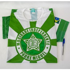 CAMISETA(TAM M) EM MALHA BRANCA, DE MANGA CURTA. NA FRENTE, EM VERDE, LOGOMARCA DA 'G.R.E.S. MOCIDADE INDEPENDENTE DE PADRE MIGUEL'. MESMA ESTAMPA ATRÁS. EM UMA DAS MANGAS, BANDEIRA DO BRASIL. ACONDICIONADA EM SACO DE TNT VERDE, COM NOME DA ESCOLA DE SAMBA.