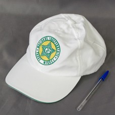 BONÉ EM TECIDO BRANCO. NA FRENTE, EM VERDE E AMARELO, LOGOMARCA/BRASÃO DA 'G.R.E.S. MOCIDADE INDEPENDENTE DE PADRE MIGUEL'. ATRÁS, BANDEIRA DO BRASIL E 'RIO DE JANEIRO'.