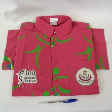 CAMISA SOCIAL (TAM M) EM TECIDO NA COR ROSA, DE MANGA CURTA. POSSUI ESTAMPADO EM VERDE, DESENHO ESTILIZADO DE UMA PESSOA E UMA SOMBRINHA DE FREVO. NA FRENTE, DOIS BORDADOS, '100 ANOS DE FREVO' E 'G.R.E.S. ESTAÇÃO MANGUEIRA'.