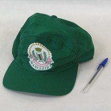 BONÉ EM TACTEL VERDE. NA FRENTE, ESTAMPA COM O BRASÃO DA 'G.R.E.S. ESTAÇÃO PRIMEIRA MANGUEIRA'.